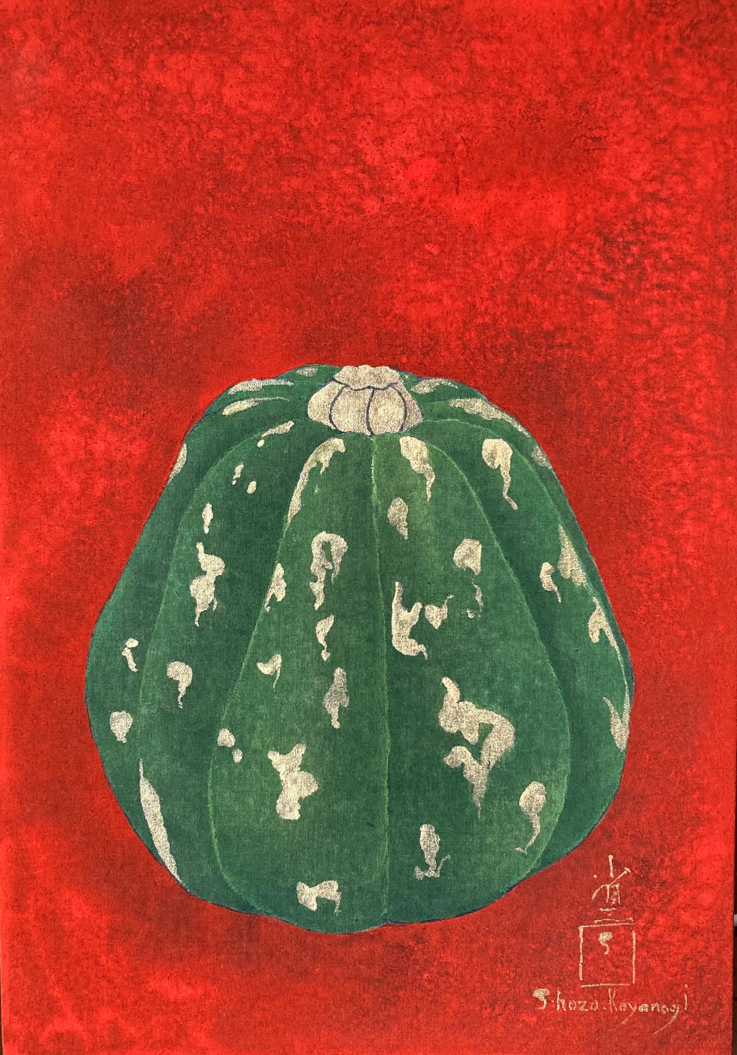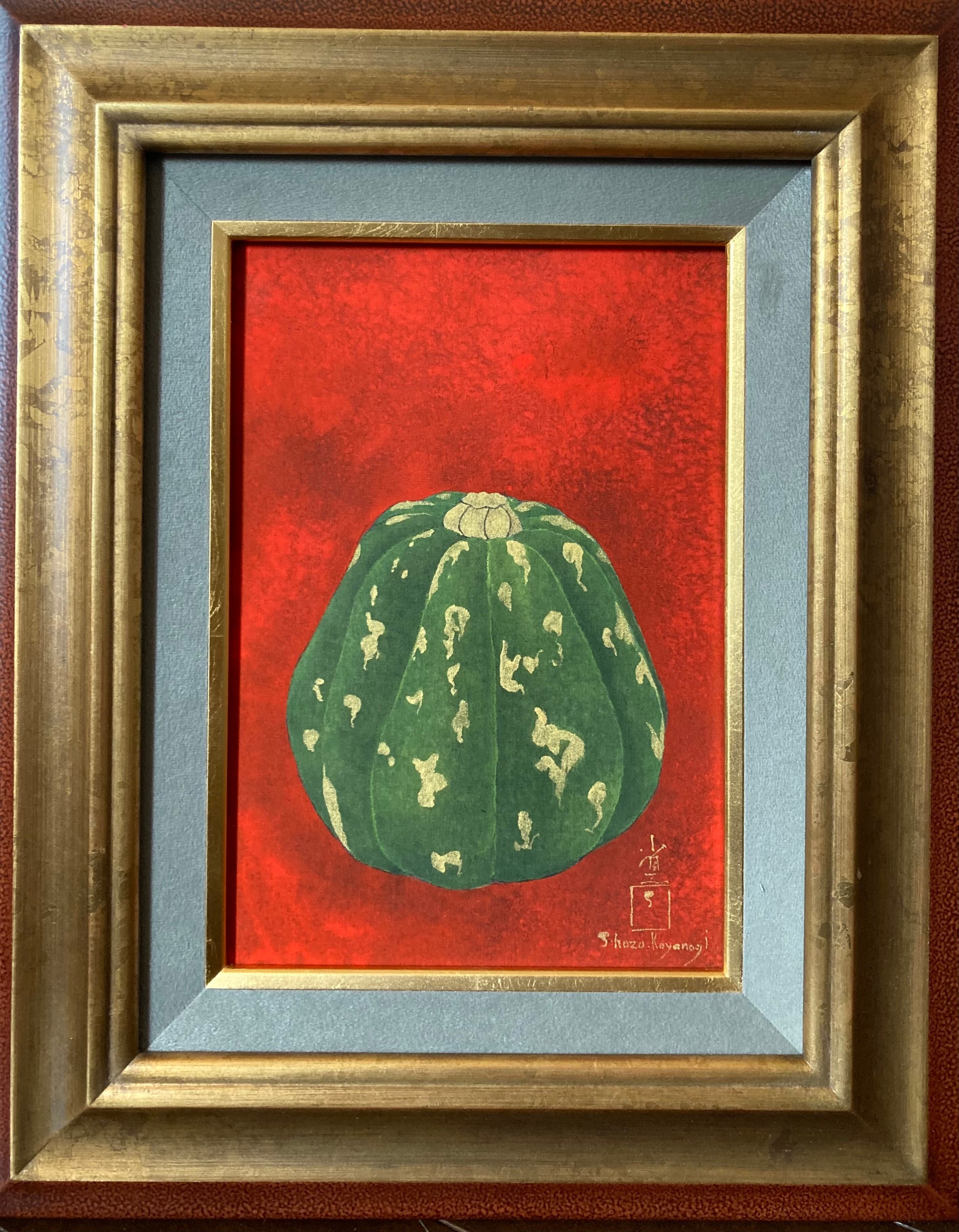 日本画法を用いて綿布に描かれたかぼちゃの絵画です。